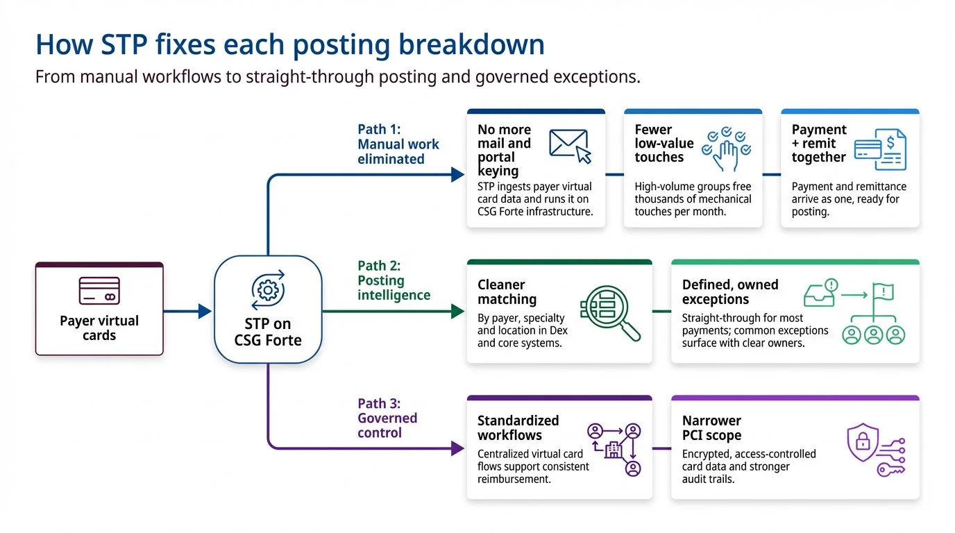 In the Optum + CSG Forte model, STP keeps the payer’s virtual card construct, but automates what happens next:
