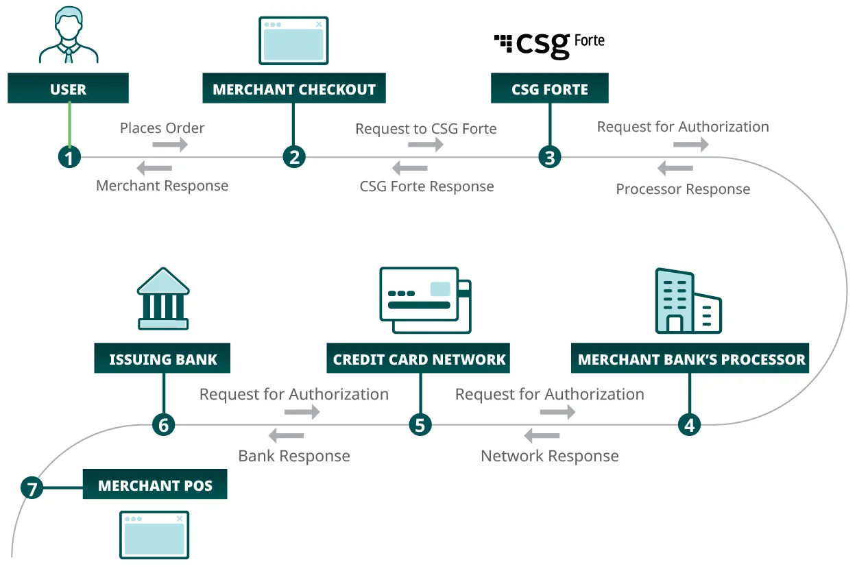The merchant checkout accepts the card information and sends it to a service to manage the interactions with the merchant’s bank.